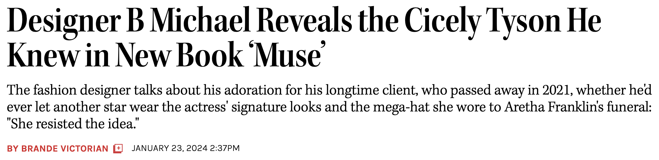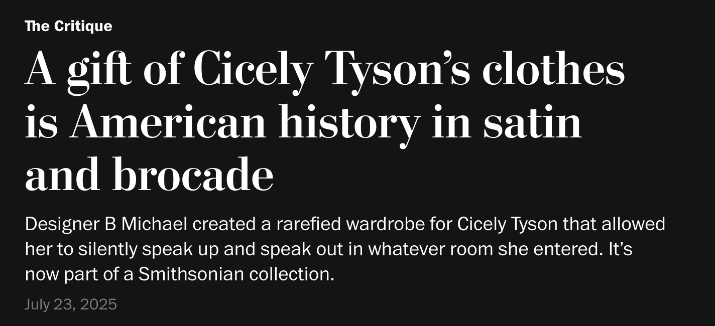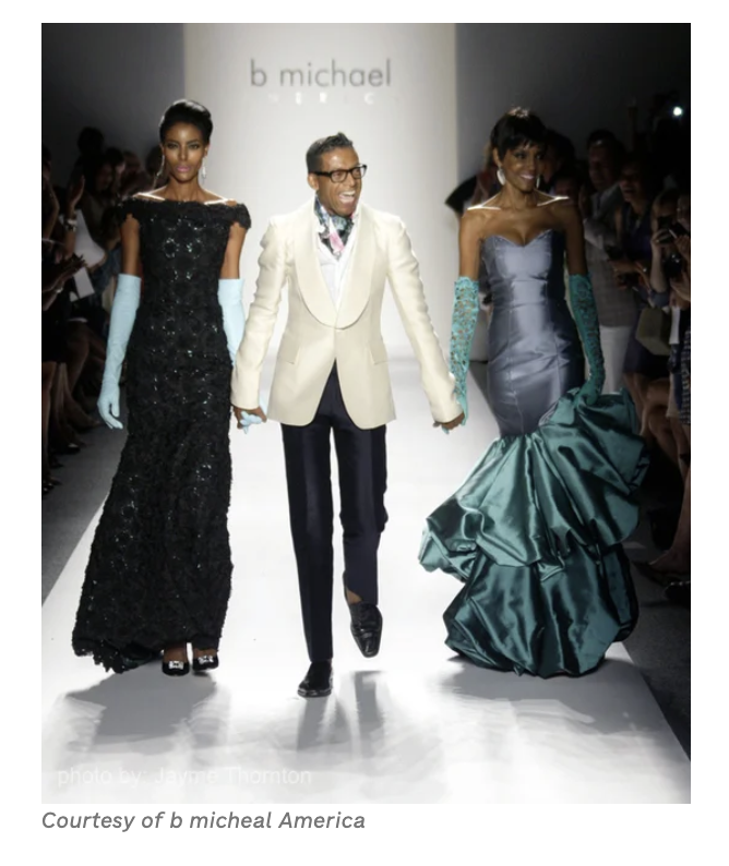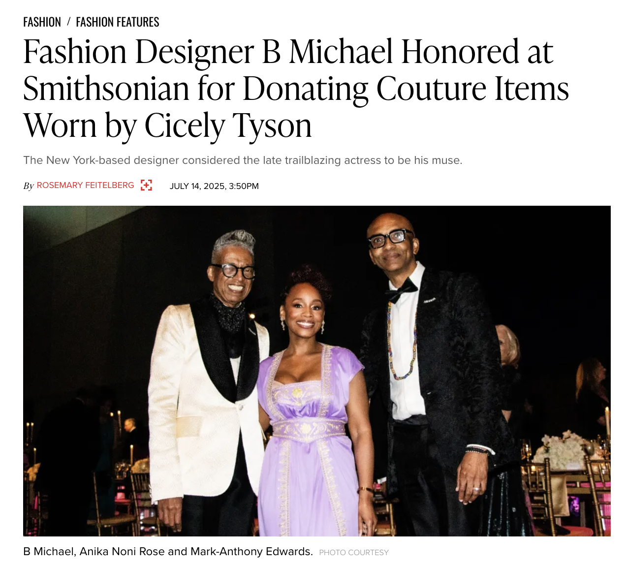 In 1998, with the support of Oscar de la Renta, B Michael was granted membership in the distinguished, Council of Fashion Designers of America (CFDA). B Michael’s work has received critical acclaim and recognition of artistic and historical significance in the wider cultural sphere. 2025, B Michael and Mark-Anthony Edwards, husband, co-founder and CEO, of B Michael Global, gifted to the permanent collections of the Smithsonian National Museum of African American History and Culture, many of the iconic B Michael Couture garments, worn by the late Cicely Tyson, legendary actor and activist, for many of her most iconic occasions.