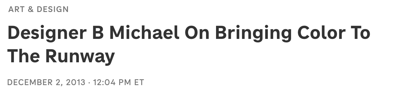 B Michael’s collections have garnered appreciative fans and loyal clients, including, titans of industries, professionals, socialites, pop-culture personalities, and legends of film, theater and music, such as, Cicely Tyson, Valerie Simpson, Beyonce, Phylicia Rashad, Susan Fales- Hill, and the iconic greats, Nancy Wilson, and Lena Horne, among many others. B Michael also designed Whitney Houston’s costumes for the motion picture, Sparkle, and ballet costumes for the Joffrey Ballet’s World Premier of Alexei Kremnev’s Windy Sand.